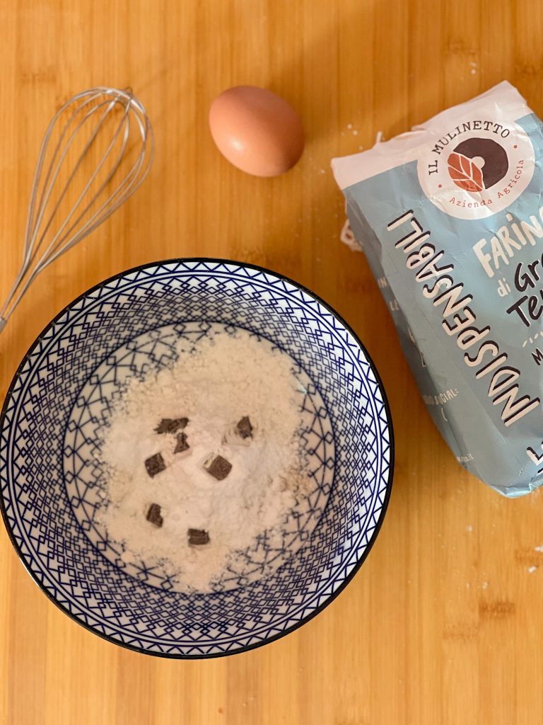 In una ciotola, mescolate la farina con il lievito e le gocce di cioccolato extra fondente.