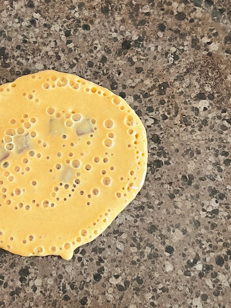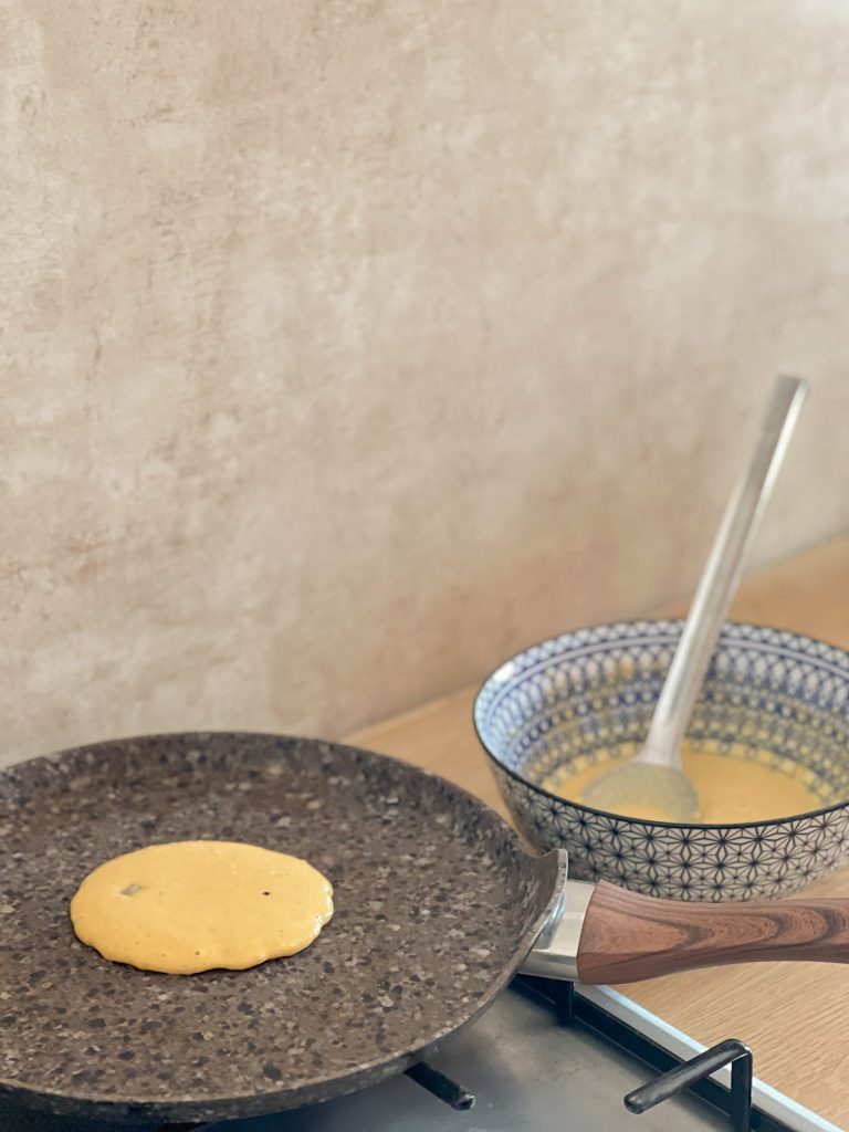Scaldate una padella antiaderente e versate un mestolo di impasto per ogni pancake. Cuocete a fuoco medio fino a quando compariranno delle bollicine in superficie, poi girate e proseguite la cottura per pochi secondi.