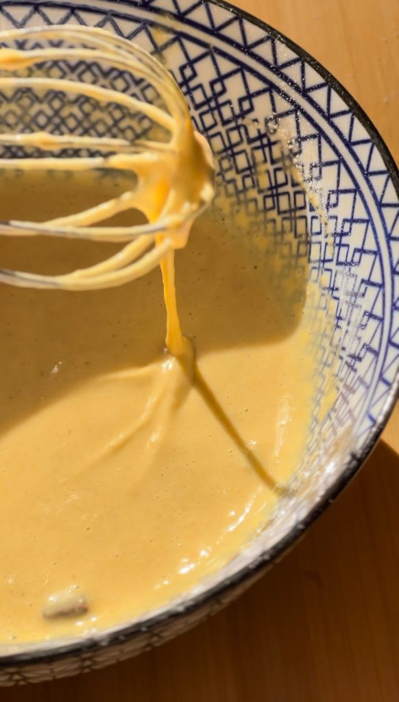 Aggiungete l’uovo, l’albume e il latte, amalgamando bene fino a ottenere un composto omogeneo.