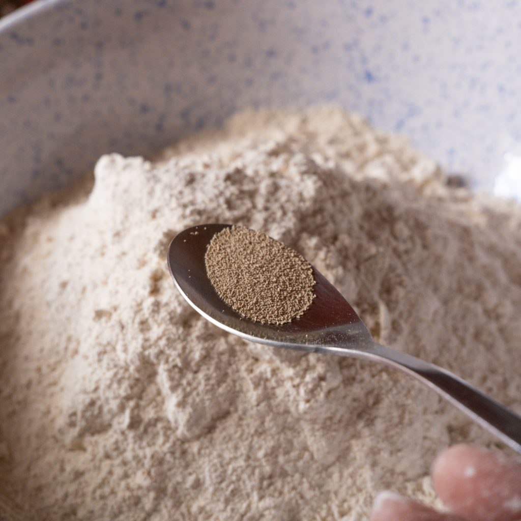 - Aggiungete il lievito di birra secco e lo zucchero, mescolando bene;