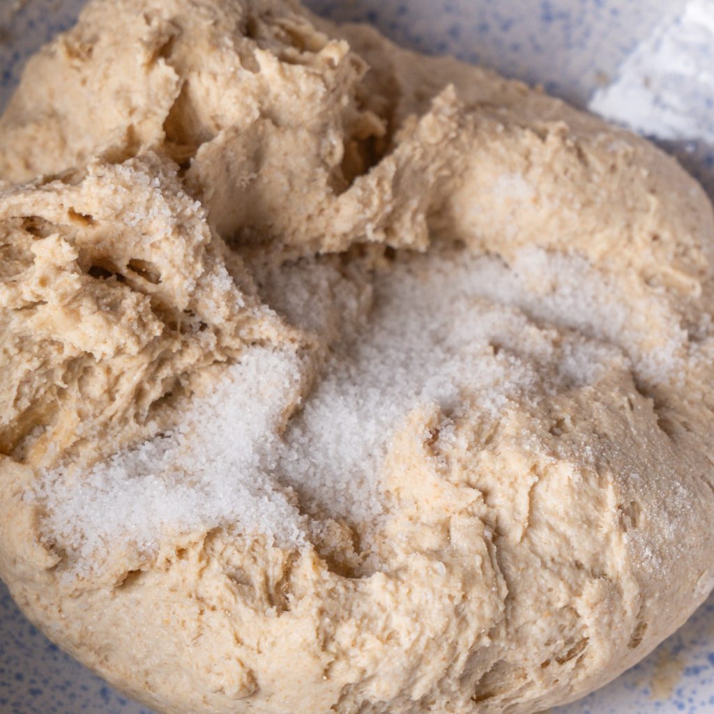- Aggiungete il sale e continuate a lavorare l’impasto, incorporando gradualmente la restante acqua fino a ottenere un composto liscio ed elastico.